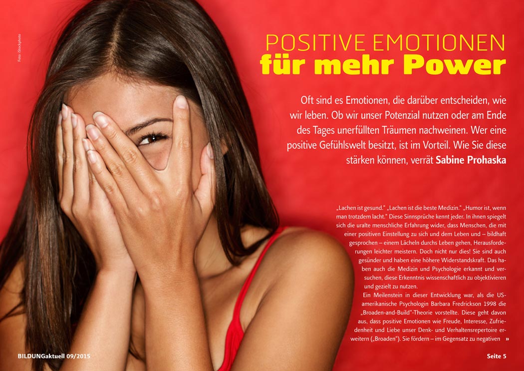 Oft sind es Emotionen, die darüber entscheiden, wie wir leben. Ob wir unser Potenzial nutzen oder am Ende des Tages unerfüllten Träumen nachweinen. Wer eine positive Gefühlswelt besitzt, ist im Vorteil. Wie Sie diese stärken können, lesen Sie ab Seite 5 in der September-Ausgabe des eMagazins BILDUNGaktuell.