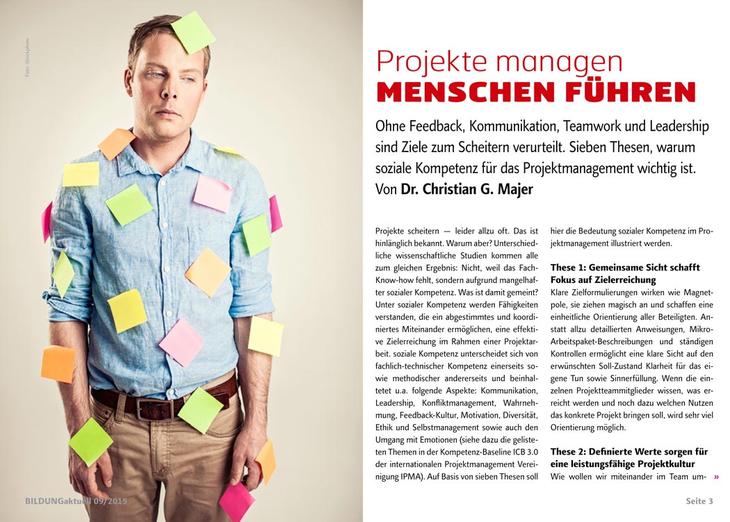 Um Projekte erfolgreich zu managen, braucht es Know-how. Fachliches Wissen allein reicht aber nicht aus. Damit alle Mitarbeiter an einem Strang ziehen, ist vor allem soziale Kompetenz gefragt. Wo nämlich zum Beispiel Feedback, Kommunikation, Teamwork, Selbstmanagement, aber auch Diversity und Ethik fehlen, sind Ziele zum Scheitern verurteilt. Sieben Thesen, warum soziale Kompetenz für das Projektmanagement so wichtig ist, analysiert Dr. Christian G. Majer ab Seite 3 in der September-Ausgabe des eMagazins BILDUNGaktuell.